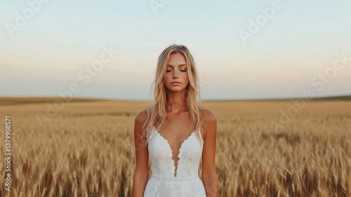 serene model in white dress stands in golden wheat field, embodying elegance and tranquility