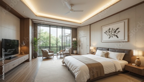 bedchamber, modern, serene, luxury, hotel, suite, room, interior, design, decor, elegant, peaceful, tranquil, calm, relaxing, home, house, apartment, residential, living, space, style, comfort, sophistication, minimalist, contemporary, window, view, nature, tree, balcony, furniture, bed, lighting, artwork, television, floor, ceiling, wall, wood