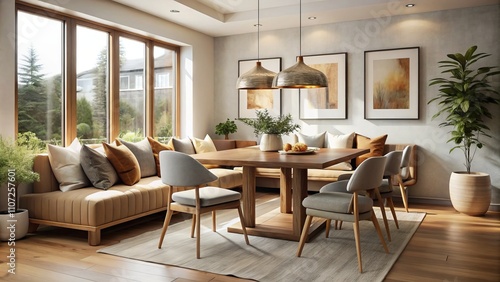 dining, airy, texture, artwork, natural, decor, contemporary, furniture, bright, elegant, inviting, relaxation, setting, cushion, minimalist, layout, room, table, chair, calmness, idea, comfort, environment, kitchen, warmth, visual, element