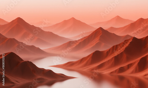 mountain, landscape, red, orange, coral, terracotta, monochromatic, water, lake, river, mist, fog, reflections, serene, peaceful, tranquil, atmospheric, abstract, minimalist, digital artwork, illustration, nature, scenery, wilderness, peak, hill, vale, horizon, dreamy, aethereal, calm, quiet, idylli, artistic, graphic, clean, modern, aerial view, gradient, background, wallpaper, banner, website, advertisement, design element, travel
