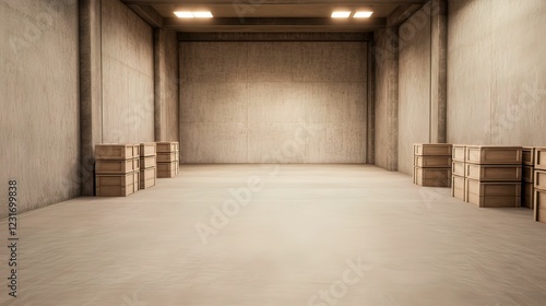 Serene monochromatic warehouse with neatly stacked crates industrial setting minimalist aesthetic interior viewpoint calm concept