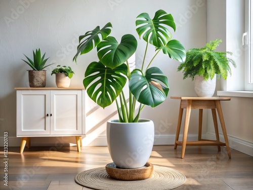 Serene Monstera Green Plant in White Pot Enhancing Neutral Decor in Modern Home Interior Setting for Stylish Living Space Inspiration