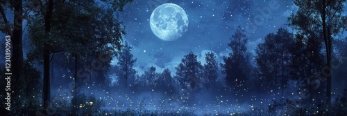 moon, night, forest, tree, star, sky, dark, mystical, serene, magical, enchanting, wood, nature, landscape, tranquil, peaceful, calm, quiet, mysterious, shadowy, aethereal, dreamy, glowing, insect, light, blue, darkness, ambience, atmosphere, fog, mist, summer, evening, beauty, scene, artwork, digital, art, illustration, background, image, picture, photo, visual