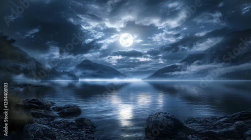 Serene moonlit lake scene with hills and clouds. mystical moonlit scene. illustration. Mystic Lake. Illustration