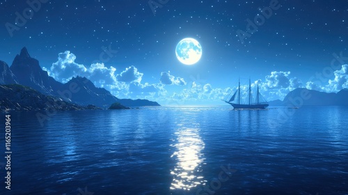 Serene moonlit night seascape with sailboat.