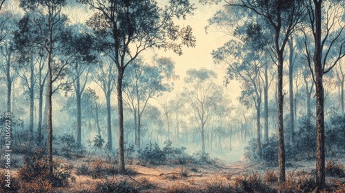 Serene Morning in Misty Forest with Soft Light Illuminating Trees and Foliage in Tranquil Natural Landscape