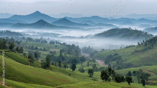 Serene morning mist unveils rolling green hills scenic landscape photography majestic mountains natureโ€™s beauty