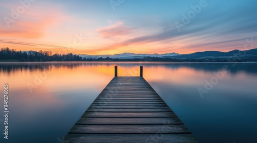 Serene morning on a tranquil lake featuring a minimalist wooden pier bathed in soft sunrise light
