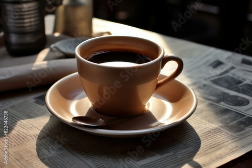Serene morning setting featuring a cup of coffee on a saucer with a newspaper in soft sunlight