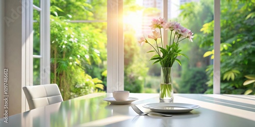 sunlight, minimalist, dining table, setting, flower, delicate, cup, simple, green, garden, view, serene, morning, table, plate, fork, vase, home, interior, peaceful