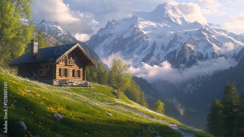 Serene Mountain Cabin Escape: A breathtaking view of a cozy log cabin nestled in a verdant alpine meadow, with majestic snow-capped mountains in the backdrop.