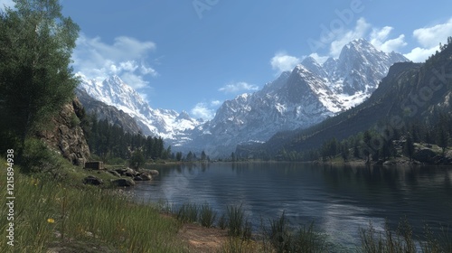 lake, idylli, vista, mountain, scenic, serene, calmness, peak, scenery, wilderness, peaceful, environment, landscape, quiet, picturesque, water, calm, panorama, nature, forest, adventure, alpine, exploration, beautiful, sky, tree, hill, breathtaking, sunlight, majestic, cloud, summer, journey, snow, clear, ecology, rock, travel, stunning, art, digital, bright, photo