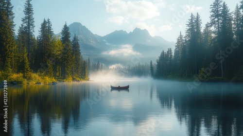 Serene Mountain Lake at Dawn: A Misty Canoeing Scene