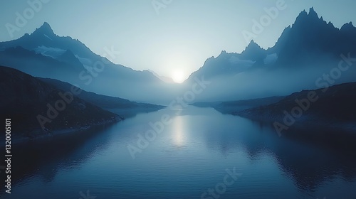 landscape, mountain, lake, water, nature, serene, calm, peaceful, tranquil, blue, grey, mist, fog, sunrise, sunset, light, calmness, peace, calmness, beauty, scenic, view, travel, photo, image, background, wallpaper, design, marketing, advertising, booklet, website, web, visual, media, content, business, commercial, promotional, stock, photo, picture, graphic, optical