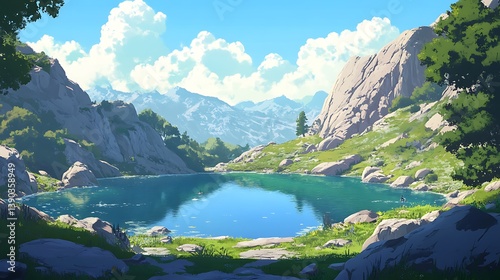 lake, mountain, landscape, nature, scenery, summer, sunny, sky, cloud, rock, water, blue, green, tree, hill, vale, tranquil, peaceful, serene, calm, majestic, beautiful, scenic, environment, wilderness, vista, view, alpine, idylli, picturesque, rural, remote, untouched, pristine, clear, flora, fauna, sunlight, shadow, horizon, day, bright