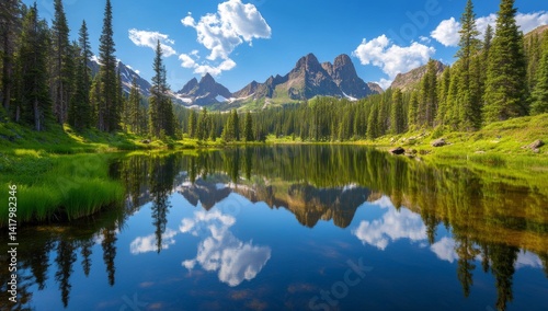 Serene mountain lake reflecting sky and peaks