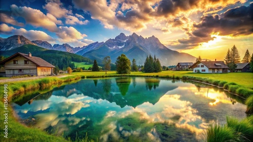 Serene mountain lake reflecting sunset sky, idyllic homes nestled on tranquil shores