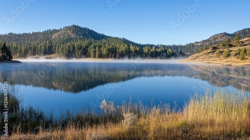 lake, mountain, tree, sky, water, serene, calm, peaceful, tranquil, nature, landscape, scenic, beautiful, picturesque, morning, mist, fog, clear, blue, autumn, fall, gold, sunlight, sun, light, hill, conifer, evergreen, vegetation, reed, grass, shoreline, bank, stillness, quiet, wilderness, environment, ecology, habitat