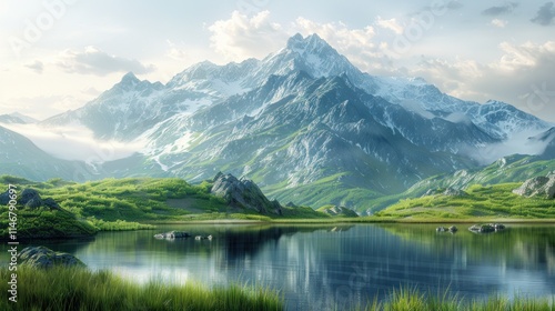 Serene Mountain Lake Reflection: Majestic snow-capped peaks mirrored in a tranquil alpine lake, surrounded by lush green meadows and a clear blue sky.