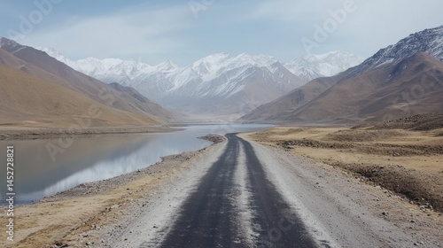 road, lake, mountain, nature, landscape, scenic, travel, adventure, journey, highway, path, route, way, track, destination, exploration, view, scenery, panorama, wilderness, serenity, calm, peaceful, tranquil, remote, solitude, escape, freedom, open, sky, water, hill, peak, snow, cold, distant, horizon, winding, asphalt
