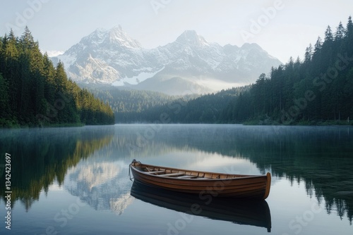 lake, bergsee, mountain, mountain chain, peak, forest, pine forest, tree, water, calm water, still water, serene, peaceful, tranquil, quiet, dawn, sunrise, morning, mist, fog, boat, wooden boat, dinghy, vessel, floating, nature, landscape, scenery, outdoors, travel, holiday, vacation, idylli, beautiful, stunning, picturesque, wilderness, natural beauty, calmness, serenity, calm, majestic