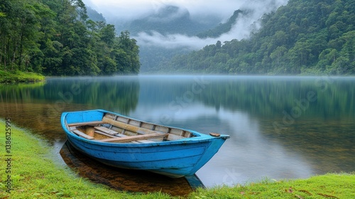 lake, mountain, boat, dinghy, water, serenity, calm, nature, scenic, landscape, peace, tranquil, still, blue, green, tree, forest, fog, mist, sky, shore, grass, bank, cloud, hill, travel, photo, image, picture, photo, view, scenery, beautiful, amazing, marvellously, idylli, picturesque, get-away