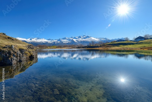 Serene mountain lake with snow-capped peaks reflecting in the calm waters