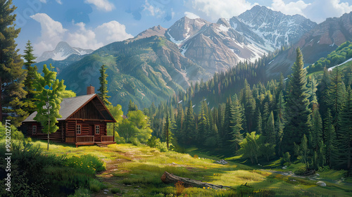 Serene Mountain Landscape A Solitary Cabin Nestled Background AI Generative