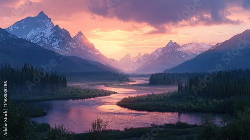 Serene Mountain Landscape Reflecting the Golden Sunset Over a Winding River Through a Forest of Evergreen Trees, Capturing the Majestic Beauty of Nature's Untouched Wilderness