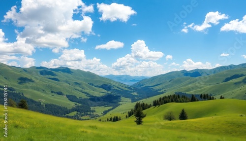 Serene mountain landscape shows green valleys under clear blue sky. Rolling hills, meadows cover valley. Scenic panorama perfect for relaxation, outdoor activities. Tranquil scene ideal for nature