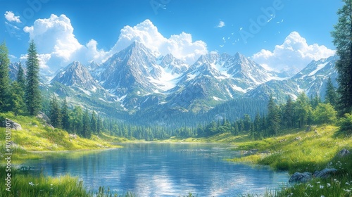 mountain, lake, tree, sky, cloud, nature, scenery, water, wilderness, calmness, flora, fauna, sunlight, adventure, exploration, beauty, outdoors, landscape, serenity, peaceful, hiking, environment, ecology, summer, vale, snow, peak, blue, greenery, grass, wildlife, river, atmosphere, travel, scenic, picturesque, vibrant, natural, habitat, fresh, clear, pristine, remote, untouched, harmony, journey, escape