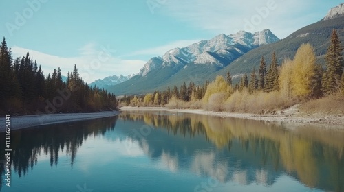 Serene Mountain Landscape with Calm River Reflections and Autumn Colors