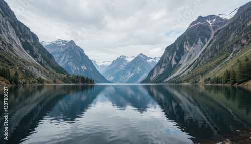 Serene Mountain Landscape with Reflective Lake and Cloudy Sky