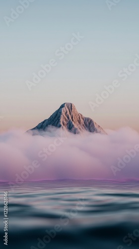 mountain, peak, cloud, sunrise, dawn, landscape, nature, scenery, serenity, calmness, peaceful, calm, sky, atmosphere, majestic, beautiful, scenic, panorama, vista, aethereal, dreamy, mystical, fog, water, ocean, horizon, stillness, quiet, solitude