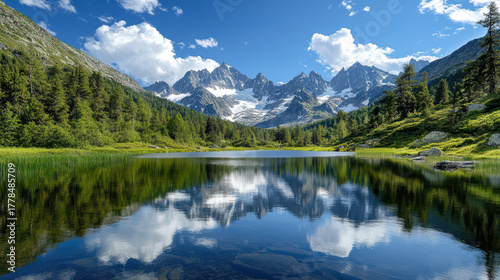 mountain, lake, greenery, sky, cloud, nature, landscape, serene, water, tree, peak, tranquil, scenic, blue, summer, wilderness, beautiful, calm, environment, travel, adventure, scenic view, high fidelity, picturesque, alpine, peaceful, natural, scenery