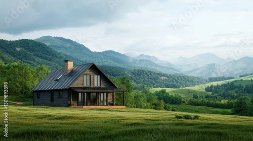 house, mountain, landscape, nature, greenery, residential, home, relaxation, calmness, scenic, architecture, rural, cloudy, grass, peaceful, daylight, modern, countryside, environment, vacation, building, wild, property, view, remote, rural area, no people, exterior, sunshine, foreground, horizon, setting, tree, natural, sky, timberland, field, sunny, scenery, wildlife, fresh air, summer, landscape design, real estate, adventure, escape, journey, solitude