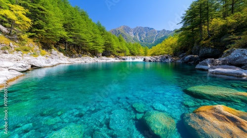 nature, landscape, mountain, river, water, turquoise, clear, serene, peaceful, tranquil, vale, tree, green, lush, forest, rock, stone, sky, blue, sunlight, summer, scenery, travel, adventure, exploration, wilderness, environment, ecology, beauty, picturesque, breathtaking, majestic, panoramic, calm, relaxation, escape, holiday, vacation, get-away, serenity, pristine, untouched, vibrant, refreshing, idylli