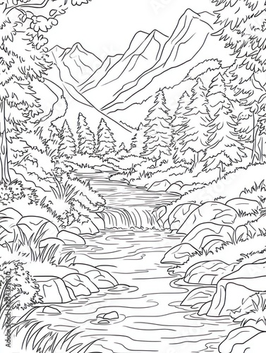 river, waterfall, mountain, tree, forest, nature, landscape, scenery, rock, water, stream, creek, hill, greenery, foliage, pine, conifer, wood, wilderness, colouring, page, illustration, drawing, vignetting, art, design, peaceful, tranquil, serene, calm, quiet, idylli, picturesque, environment, ecology, ecosystem, summer, spring, fall, autumn, vale, vista, view