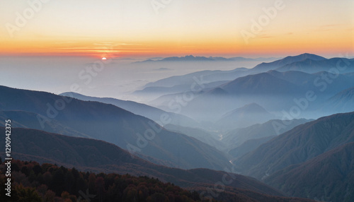 Serene mountain sunrise over misty valleys, nature's tranquility