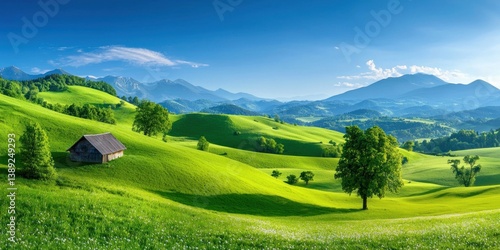 mountain, vale, landscape, cabin, rustic, green, hill, meadow, tree, nature, scenic, summer, sun, sky, cloud, pastoral, rural, tranquil, serene, peaceful, calm, beauty, picturesque, idylli, vibrant, lush, rolling, grassy, field, foliage, horizon, vista, view, environment, ecology, wilderness, country, farmland, agriculture