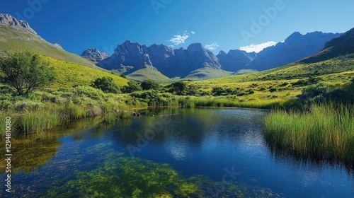 Serene mountain valley with lush greenery and reflective pond under clear blue sky