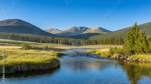 Serene Mountain Valley with Meandering Stream: Wilderness Landscape in Golden Light