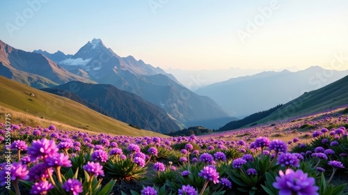 purple flower, mountain chain, hillside, wildflower, meadow, sunrise, sunset, alpine, nature, landscape, scenery, panoramic, view, flora, vegetation, bloom, blossom, environment, outdoors, scenic, beauty