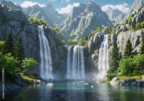 Serene mountain waterfall cascading into calm pool vibrant sunlight. AI Generated