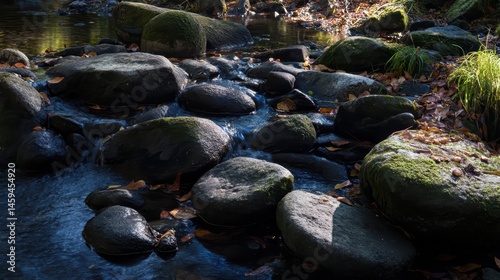 Serene Natural Scene with Rocky Stream and Moss-Covered Boulders, Crystal Clear Water, Fallen Leaves.