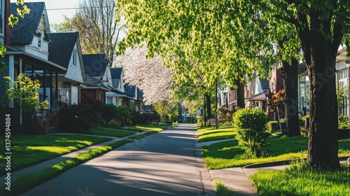 Serene Neighborhood Scene with Lush Green Trees and Blossoming Flowers Along a Quiet Suburban Street on a Bright Spring Day