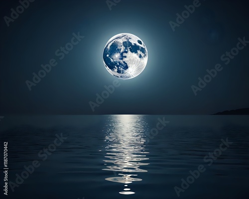 moon, ocean, sea, night, water, calm, serene, peaceful, tranquil, dark, blue, moonlight, mystical, magical, dreamy, fantasy, atmosphere, nature, landscape, background, illustration, digital artwork, artwork, graphic, design, texture, pattern, serenity, calmness, peace, meditation, relaxation, spa, yoga, sleep, dream, night sky, star, horizon