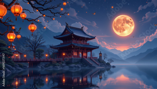 Serene night scene featuring traditional Asian temple illuminated by lanterns, reflecting on calm waters under full moon. mountains in background add to tranquil atmosphere