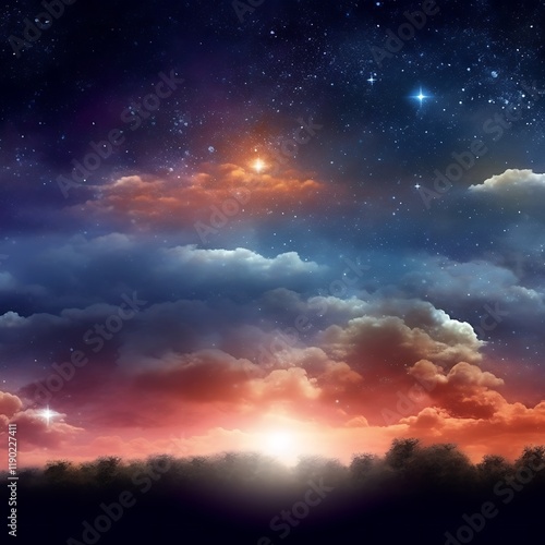 night, sky, sunset, cloud, cloudscape, star, twilight, evening, dawn, sunrise, celestial, cosmic, universe, galaxy, space, nebula, atmosphere, horizon, landscape, scenery, nature, background, beauty, colourful, vibrant, tranquil, peaceful, serene, magical, mystical, dreamy, aethereal, majestic, wonder, bright, dark, light, red, orange, blue, purple, tree, silhouette, dusk
