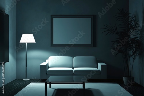 living, room, night, serene, minimalist, design, sofa, lamp, floor, lighting, soft, artwork, framed, picture, modern, calm, peaceful, relaxation, interior, decor, home, furniture, style, ambience, atmosphere, elegant, sophisticated, clean, simple, comfort, luxury, contemporary, aesthetic, tone, mood, palette, shade, grey, blue, plant